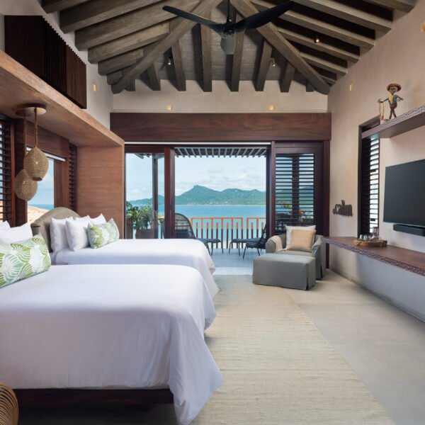 Two queen-size beds, En-Suite bathroom, Walk-out deck to the pool, Soaking tub, Indoor / outdoor shower