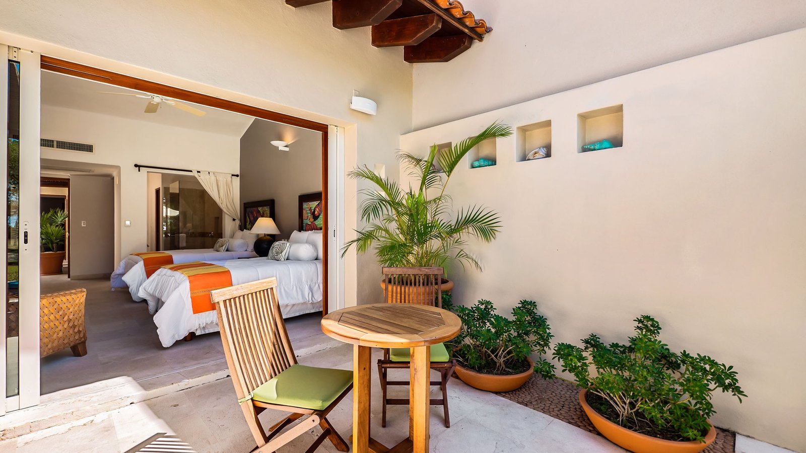 King-size bed, En-Suite bathroom with rain shower, TV, private patio, outdoor furniture, A/C